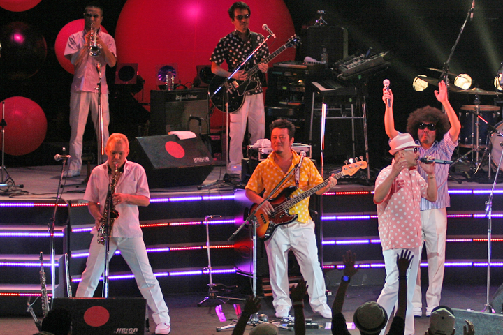 3曲目は早々にマンモス・シングル『肉体関係』を披露。crazykenのキーボードに、のっさんの渋いギターサウンドが絡み合い、そこにジャッカルが奏でる甘いサックスのメロディーが重なると、フレアーのミニスカートを纏ったaicoが登場!ステージがパッと華やかになった。4曲目は最新アルバム『ZERO』から『夏』を披露。crazyken、aico、テツニによるヴォーカルの掛け合いが印象的だった。