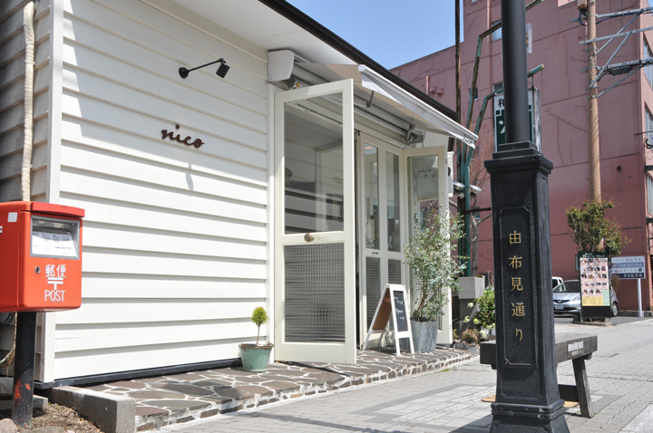 しばらくすると左手に、アイボリーの壁に 「nico」と書かれた、お花屋さんが併設された、かわいらしい店舗が現れます。