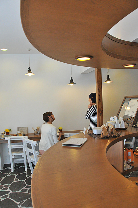 ナチュラルカントリー風の色合いが印象的なお店に入ると、半円形の重厚感のあるショーケースが目に飛び込んできます。その横には気軽に食事を楽しめるカウンターが……。
