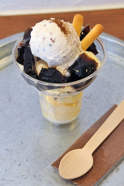 ▲濃厚な湯布院のバニラアイスと、オリジナルの雑穀アイスに、インカコーヒーで作ったコーヒーゼリーとバナナがたっぷりトッピングされた、体にいいものばかりの安心素材をつかった豪華なパフェ。中には、玄米のパフが入っており、バニラアイスと絡めると意外にもマッチした組み合わせです。