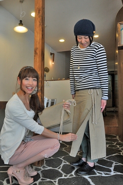 ▲食材の色合いを邪魔しない生成りのしっかりした生地でできたオリジナル。動きやすいように両脇にスリットが入っており、留める紐は異素材で少し太め。しっかりと固定できる上に、長さもオシャレです!