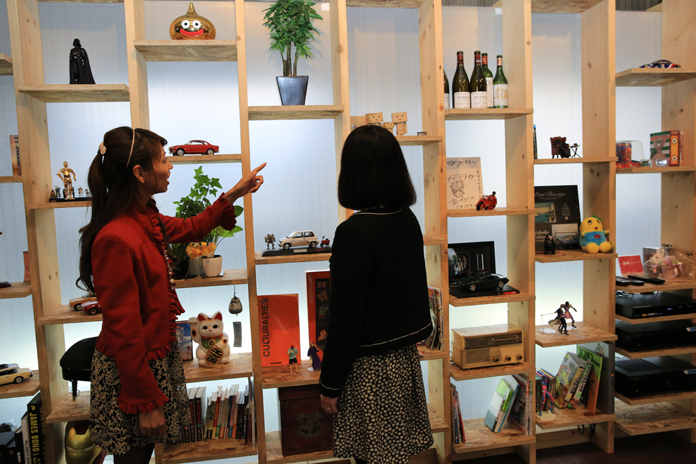 店内はかなりの奥行きがある広いスペースとなっており、中央にはシンプルなソファーセットが規則的に配置され、壁には意図的に不揃いを計ったスケールの大きなディスプレイ棚が目に飛び込んできます。