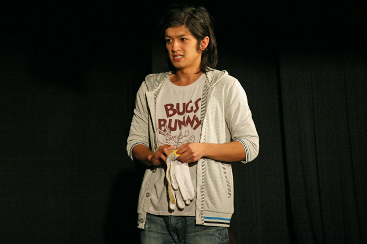 「いや〜1年半ぶりの舞台でした……。ん〜自分的にまだまだ納得はいってませんね……。明日はもっともっと気合い入れていきます。特に、今回演じた舞台裏を支えるスタッフの役というのは、日頃からハードな仕事ぶりなどを目の当たりにしているだけに、まだまだこんなもんじゃないっていう感覚も肌でわかっているから難しいですね……。でも、この作品のおかげで、スタッフに対する視点が今までとは違ったものになっているでしょうから、いい経験になっていると思います。またお客さんへの全体的な見せ方として難しかったのが、この劇場内で起こる出来事を、お客さんは最初から最後までそこに座っているのに、場面によって、お客さんがいないのが前提だったり、その逆だったり、そうした切りかわりを自然な形でお客さんに感じてもらわなければならないという部分ですね。あと、個人的には、あまり全体稽古に参加できず、逆に出演者のみなさんに助けてもらった形になるのですが、だからこそ、有村京子がひとりで高杉への思いを語るシーンに関しては力が入りました。今回はユーモアたっぷりに展開される場面が多い中、どちらかといえばシリアス担当なので、ストレートに喜怒哀楽を表現するというよりも、感情を抑えつつも、心の表情がしっかりとお客さんに伝わるような演技を心がけたので、そのあたりが伝わっていると嬉しいです」