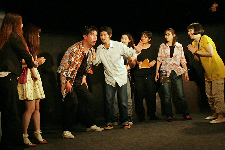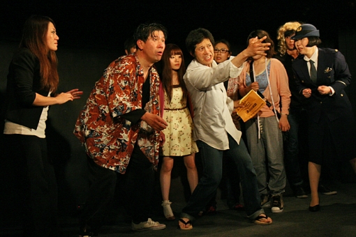 ▲そこへ、新たに無理矢理台本に書き加えられたチンピラ野口が割り込んでくるシーンが始まる。「まてまてまて〜本当の犯人はこの俺様だぁ〜!」。すかさずスポットライトをあてる森沢。何が起こっているのかわからず、ぼーぜんと立ちつくす山岸……。