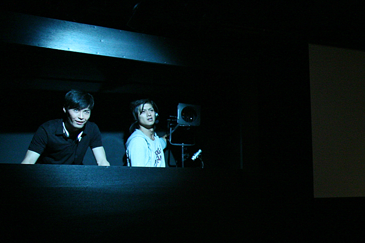 ▲買い出しから戻った信二とインカムでやりとりをするスタッフ達。「みなさ〜ん、電池買ってきました〜」「おい森沢!今どこにいる?」「客席です。みなさんが見あたらないから受付にあったインカムを借りました。高杉さんは調光室ですか?」「いや舞台だ!」「では今からそちらへ」「だめだ来るな!お前はそのインカムを絶対にはずすな。いいな!」
