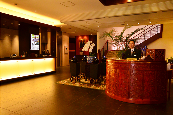 ▲「萬珍樓 本店」ロビー、きめ細かい対応で、毎日お客様を迎え入れている冨田さん。