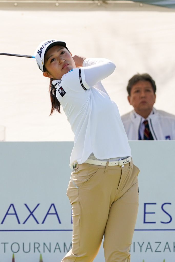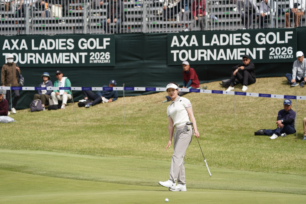 アクサレディス宮崎2026第1ラウンドは、青空が広がる宮崎の空の下、入谷響が7バーディ、ノーボギーで回り、7アンダーで単独首位に立った。1打差の単独2位に高橋彩華、5アンダー3位タイに金田久美子、地元宮崎の山内日菜子、申ジエ。4アンダー6位タイに日章学園卒のプロ入り2年目荒木優奈、穴井詩、高野愛姫、皆吉愛寿香、藤本愛菜が続いた。また10か月ぶりの実戦となる大山志保はたくさんのギャラリーが見守る中、3アンダー11位タイと好位につけた。荒木優奈・柏原明日架・菅楓華の3人が同組でラウンドとなった日章学園高校OG組も注目を集めていた。