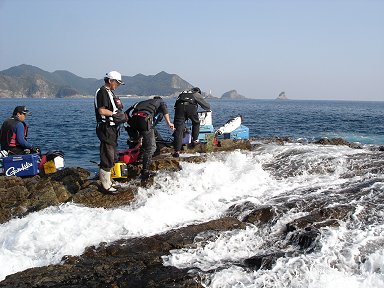 今回の参加人数は宮崎支部が25名、大分支部が10名の合計35名です。それぞれが乗船前に行われたくじ引きで渡礁順を決め、船に乗り込む際に、一番大きい番号を引いた人から荷物を積みます。