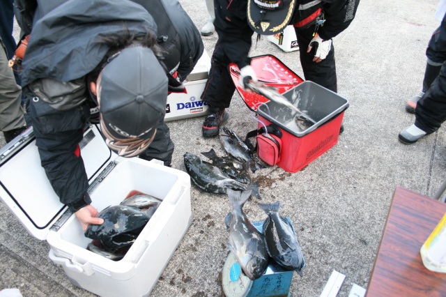 港に戻ると、既に1便・2便船の選手は検量を済ませていたようですが・・・どこもほとんど釣れていないとの事。3便で渡礁していたスズキバエの皆さんは釣っているようで検量しています。