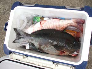 5日:チヌが4枚、クロの1.8kgが1枚、マダイの2kgが1枚、アジの27cm〜30cmが10〜20枚でした。