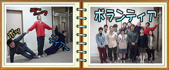 NPO法人「延岡ボランティア協会」と延岡市内の施設からボランティアの依頼をうけて活動しています。ふれあい福祉運動会や、はまゆう園の収穫祭、ふれあい福祉祭り2002などに参加。先輩、後輩関係なくボランティアだからといって何かしないといけないわけでなく、ボランティアを楽しみながら、色んなことを経験していきたいと思っています。部員一人一人が何事に対しても一生懸命取り組んでいます。特にさだまつさんが4年生で忙しいのに時間をさいて参加していただいています。 豊田 浩之