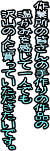 延岡市内の作業所「ひかり工房」「めばかり作業所」から作品を借りて展示即売会を行ないます。