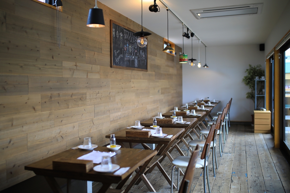 レストランは、一足先にオープンしたパン工房・ドルチェ工房につづき、2016年12月6日にリニューアルオープン。地元の海で拾われた流木や枯木、廃材を再利用してリノベーションされており、懐かしい情景を思い起こさせるような佇まいです。以前の店舗より、テラス席付きのテーブルスペースを新たに設け、より多くの方々を案内できるようにスペースが拡大されています。