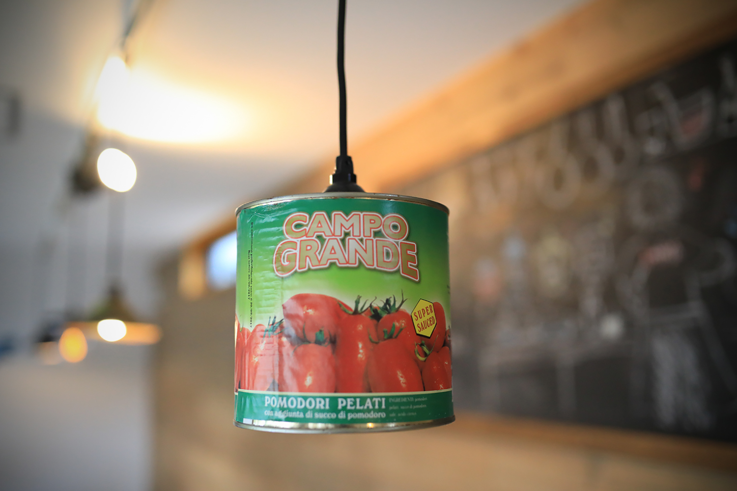 ▲金井オーナー手造りのペンダントライト。トマト缶や古食器を再利用するなど、遊び心のディテールが散りばめられています。