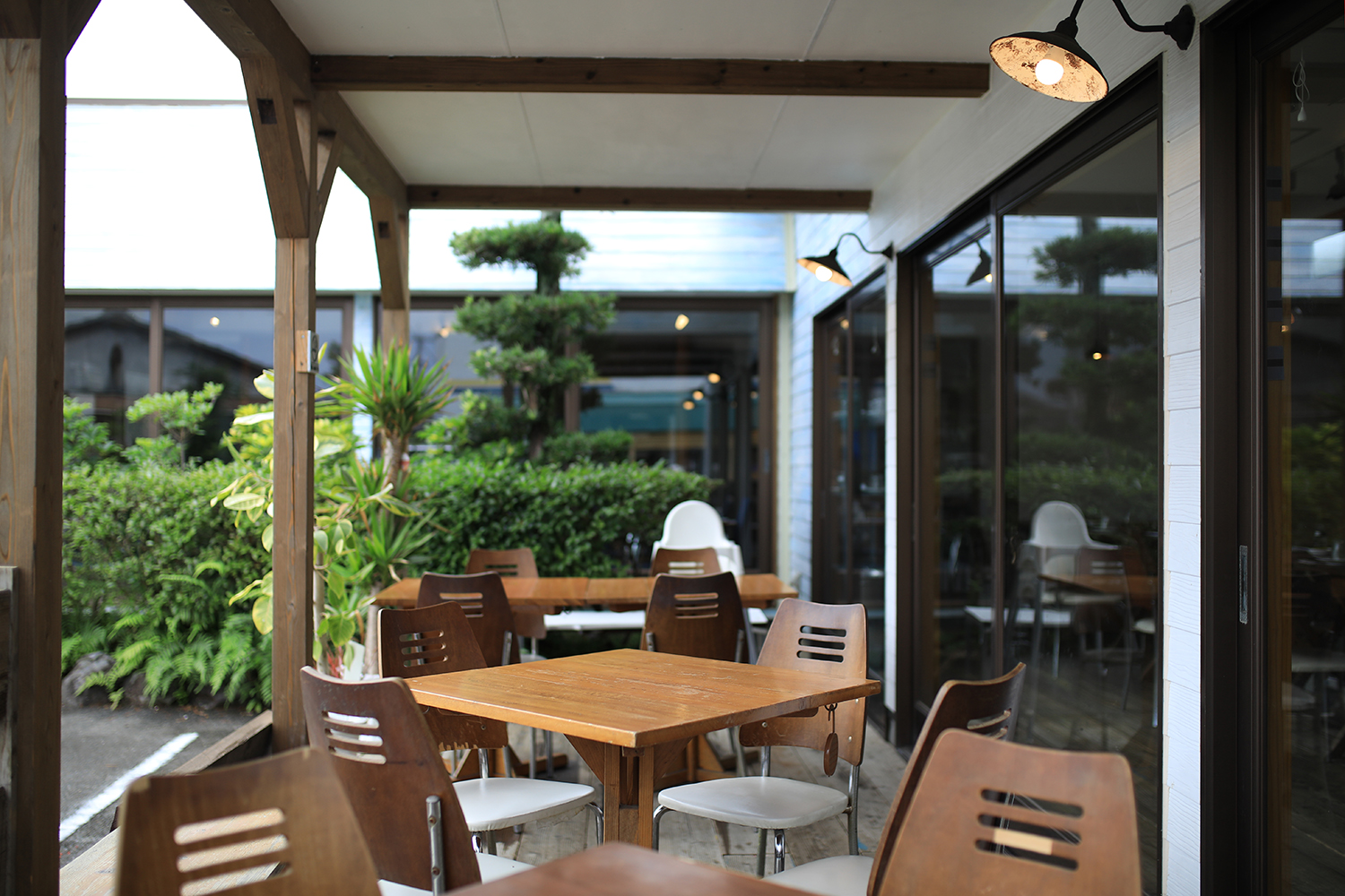 「まさに、そのようなイメージのデザインにしました。延岡市の郊外にレトロな雰囲気が漂う空間をつくり、お客様が散策しながらゆったり過ごせる場所にしたいと思っています。店舗のすぐ近くにある海岸で拾った枯木や流木をインテリアとして利用したり、外壁を白く塗った後にわざと傷を付けてレトロ感を出したり、壁紙や塗装やエントランスへのアプローチなど、ほとんど自分たちでリノベーションし、手造り感のある温かい雰囲気にしました。照明の傘にはトマト缶や古い調理器具を塗装して利用したり、倉庫を壊して広くなったスペースにテーブルセットをおいて、レストランの営業時間外でも、カフェタイムができるようにしたり、この郊外ならではの雰囲気を楽しんでもらえたらと思います」