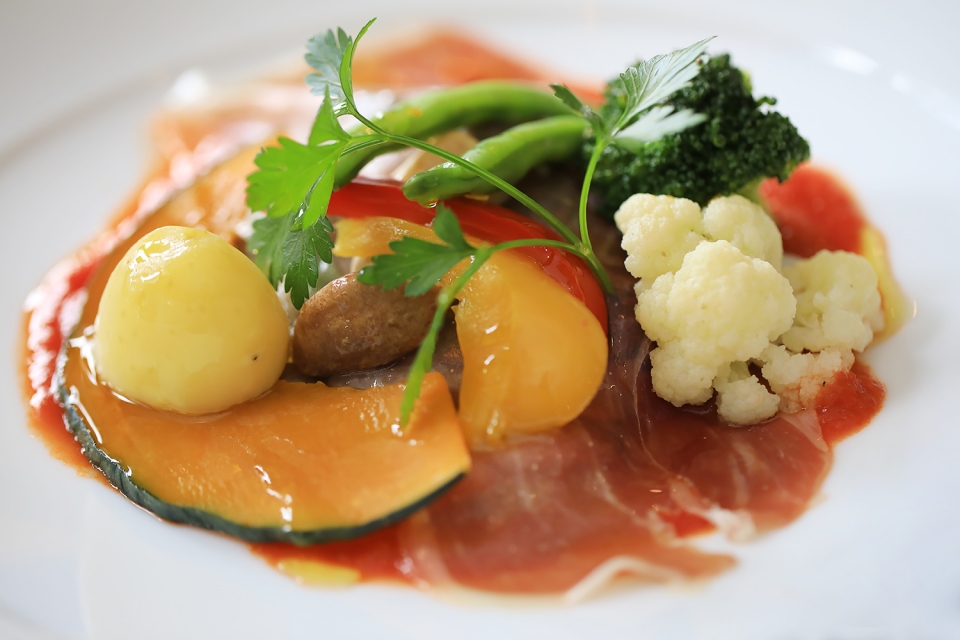 そして注目のイタリアンメニューですが、オープン当初からのテーマである『伝統的なイタリア料理をベースに、地元の食材を活かしたオリジナルスタイルを、気兼ねなく楽しんでほしい』との思いを忘れることなく、さらに、高タンパク質&低カロリーを意識し、より「ヘルシー」を具現化できる「ココット料理」がメインとなります。「ココット料理」は、油分で炒めずに素材の水分で蒸し上げるので、かなりのカロリーダウンとなり、食材の旨味が引き出されて、より繊細な風味に仕上がるのだそうです。そんなことから、今回のリニューアルでは、厨房の調理機器をすべてココット料理に視点を当て、IH機器をはじめ総入れ替えされたそうです。
