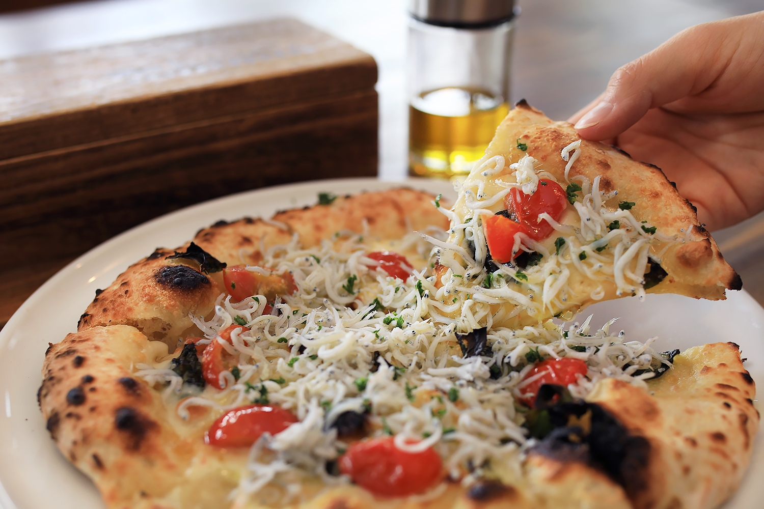 リニューアル後、新たに加わった石窯で焼き上げる、本格イタリアンピッツァ。パン工房で丁寧に仕込まれたピザ生地を使用して、石窯の高熱により一気に焼き上げます。中でも『土々呂ピッツァ』は、地元の名産である釜揚げちりめんと、上質なオリーブオイルをふんだんに使用したオリジナルで、モッツァレラチーズの濃厚なミルクの風味の中に、バジルと海の香りが爽やかに通り抜けます。