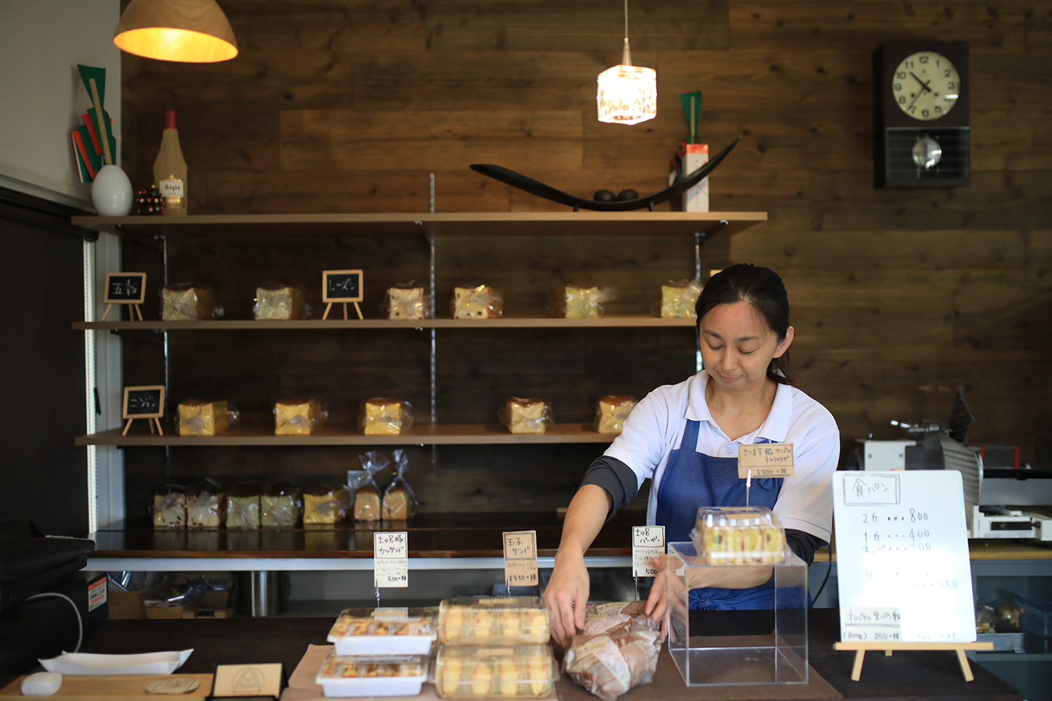 作られたパンは、古民家にあった古い和ダンスを再利用し、品よくディスプレイされている姿がチャーミングです。ガラス越しには、パンの仕込み風景を見ることができます。
