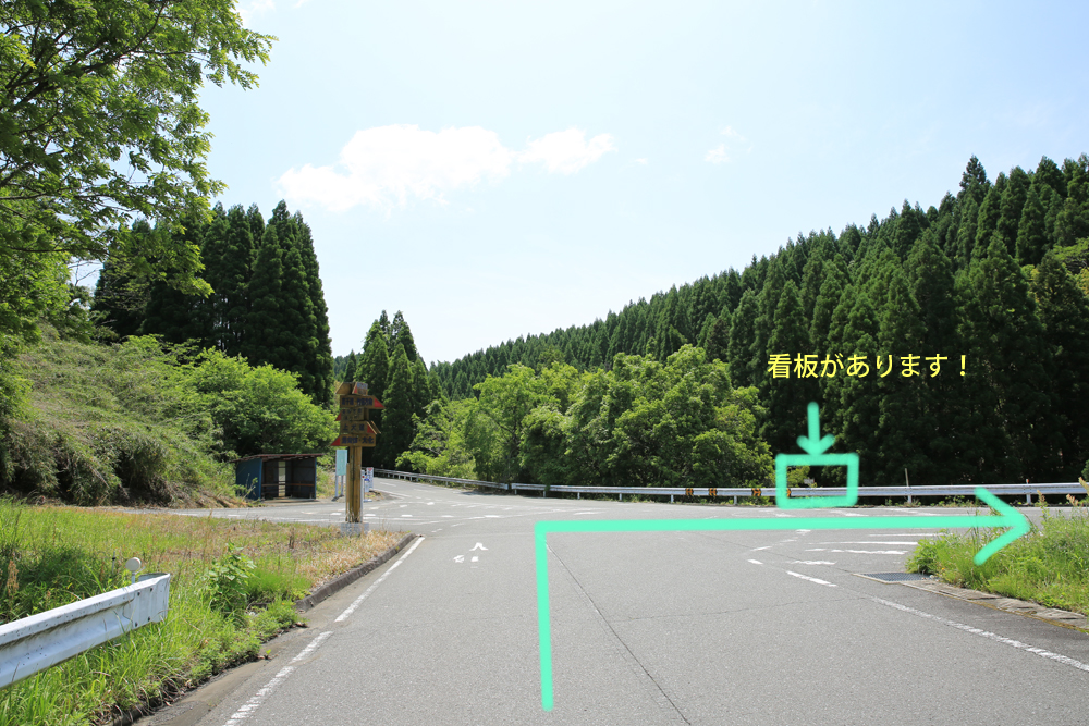 ▲直進してさらに数分ほど進むと、ガードレールのある大きな交差点に差し掛かります。ここを”右折”です。右上のような看板があります!
