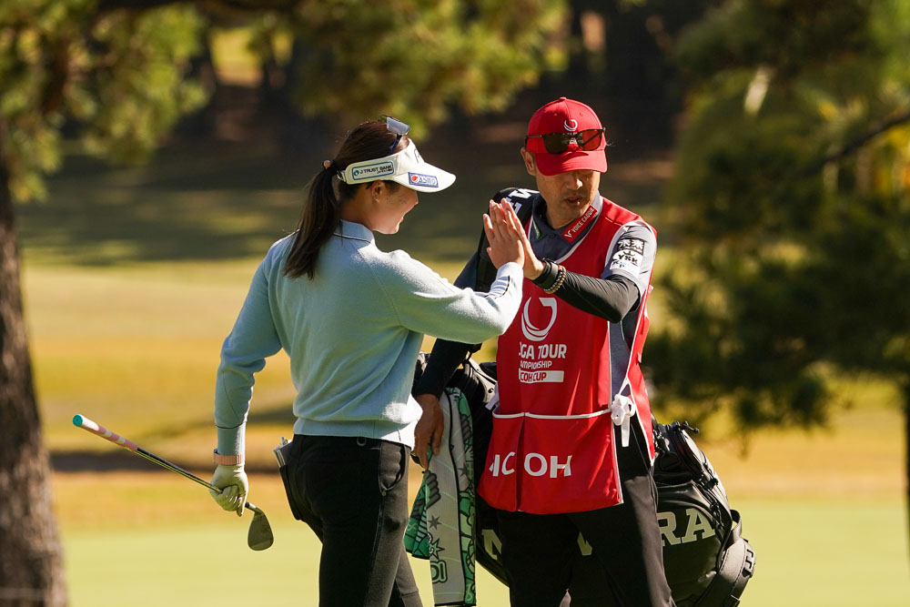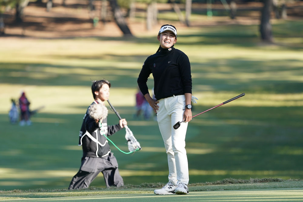 「1番ちょっとボギーだったのが悔しくて。上がってみてイーブンだったので、良い方かなと思います。(明日は千怜さんと同組)明日、明後日はコラボシャツを着ようと思ってて。まだ決まってないですね。(アメリカでも)単純にトレーニングも2人でできるし、単純に楽しさが2倍になりますね。いい位置で明日もラウンドできるので、いつもと変わらず楽しんで攻めのプレーが出来たらいいかなと思います。」