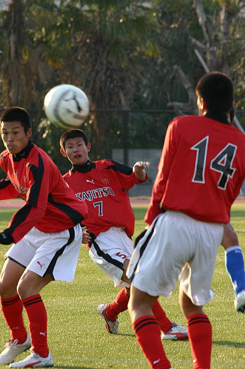 鵬翔:前半開始後すぐに失点。昨日に続き、またまた先制点を奪われてしまいました。ディフェンス面での連携に不安があり、攻撃に移るスピードも選手権予選のときより遅く感じます。相手が強化しているのが原因と考えられますが、全国大会ではこのレベルでの戦いは必至で、明日こそはしっかりとした守備を見たいと思います。