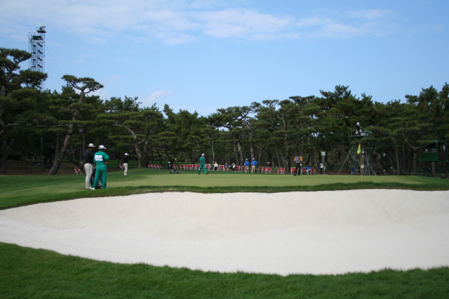 ついに1打差に迫った諸見里だが、1stが右松林のラフへ!深いラフだった様で、FWに戻すだけのリカバリーとなった。対する横峯はキチッとピンそばへ2オンに成功。何とかパーをキープしたい諸見里だが、3rdはグリーン手前へ。もちろんチップインを狙いに行くも、残念ながら外れてしまいこのホール痛恨のボギーとなってしまった。横峯はキチッと2パットで決めパーセーブとした。